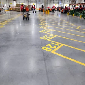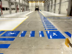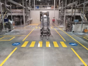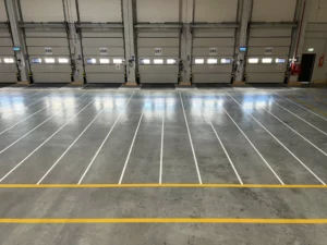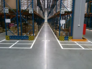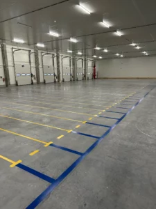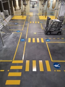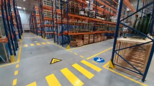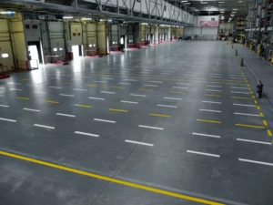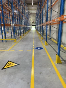 Linien, Flächenmarkierungen, Fußgängerüberwege, Piktogramme oder Parkplätze für Gabelstapler sorgen für eine klare Organisation des Raums. Präzise Regalmuster helfen dabei, die verfügbare Fläche optimal zu nutzen und die Arbeitssicherheit zu erhöhen.
