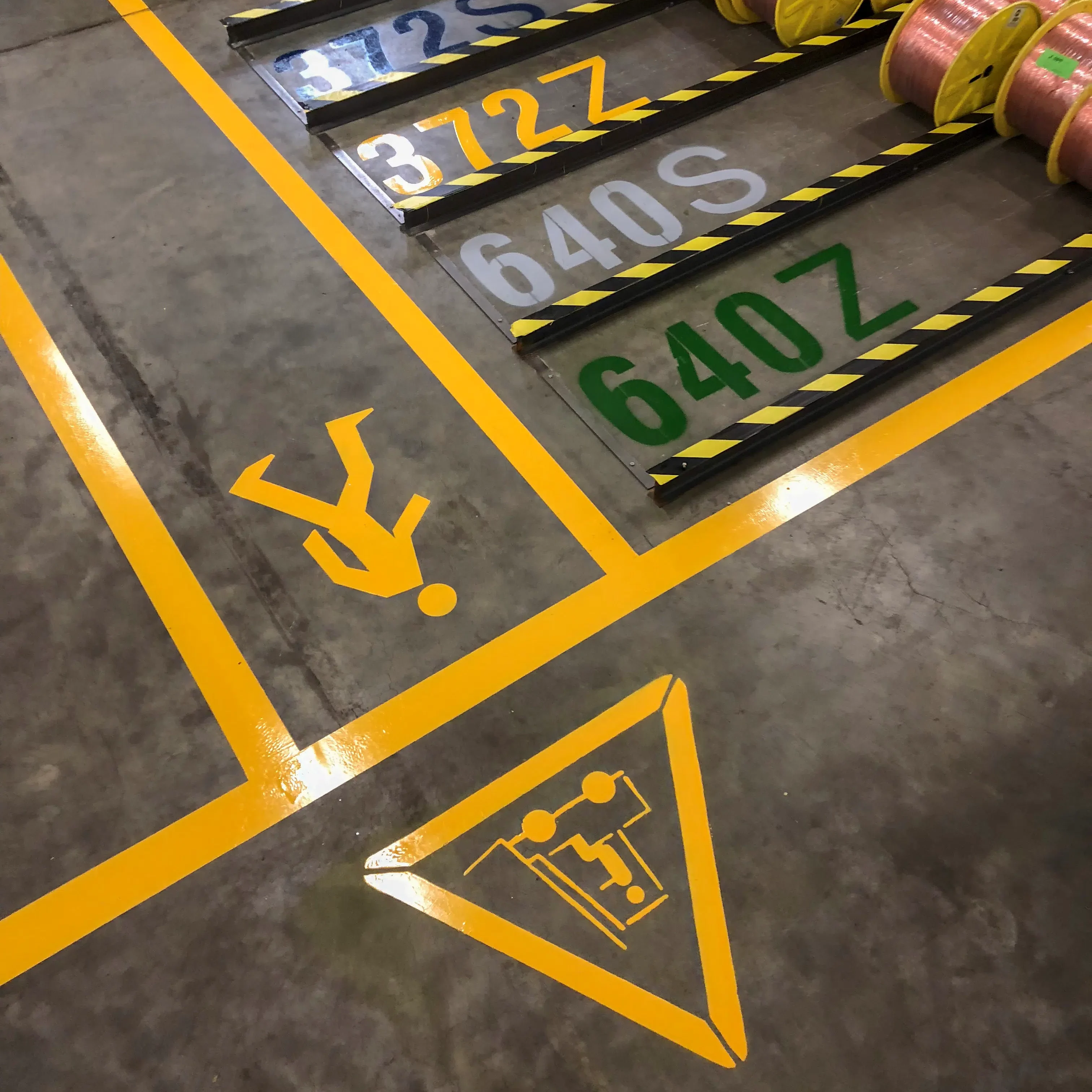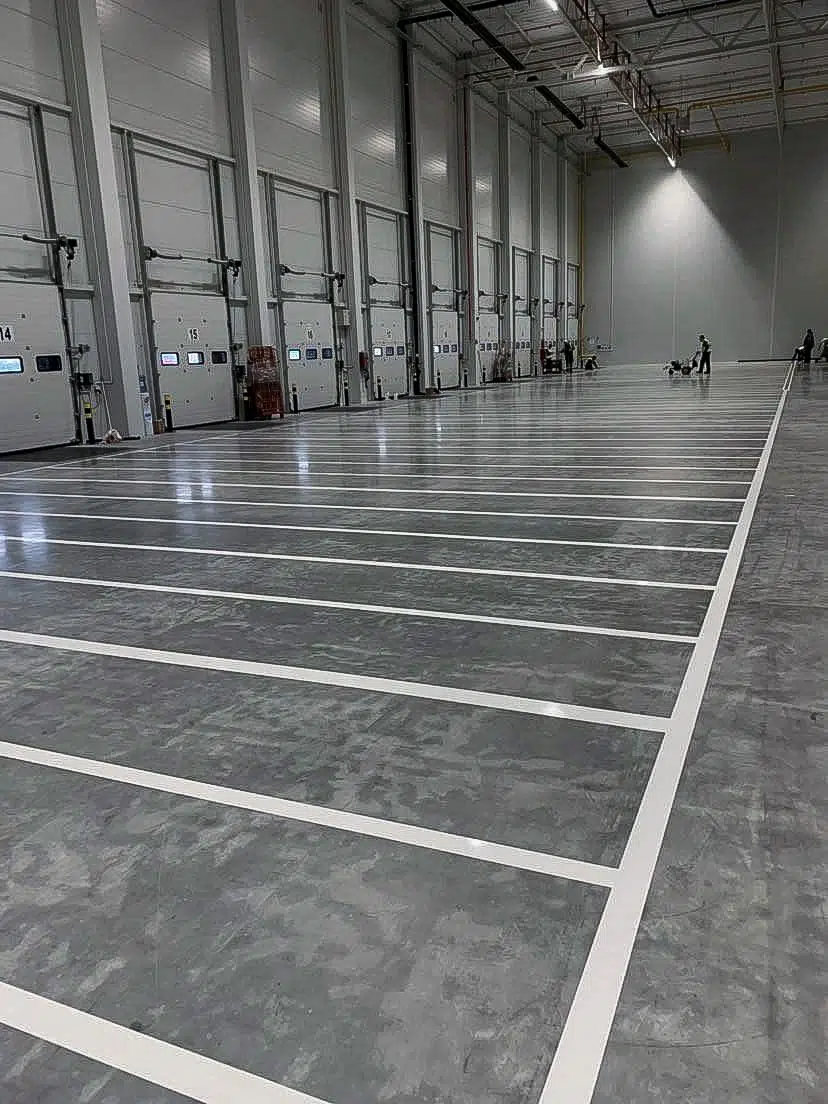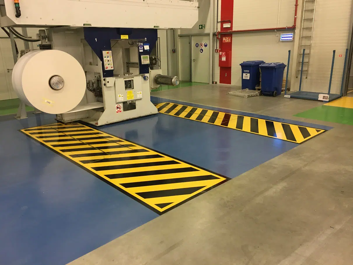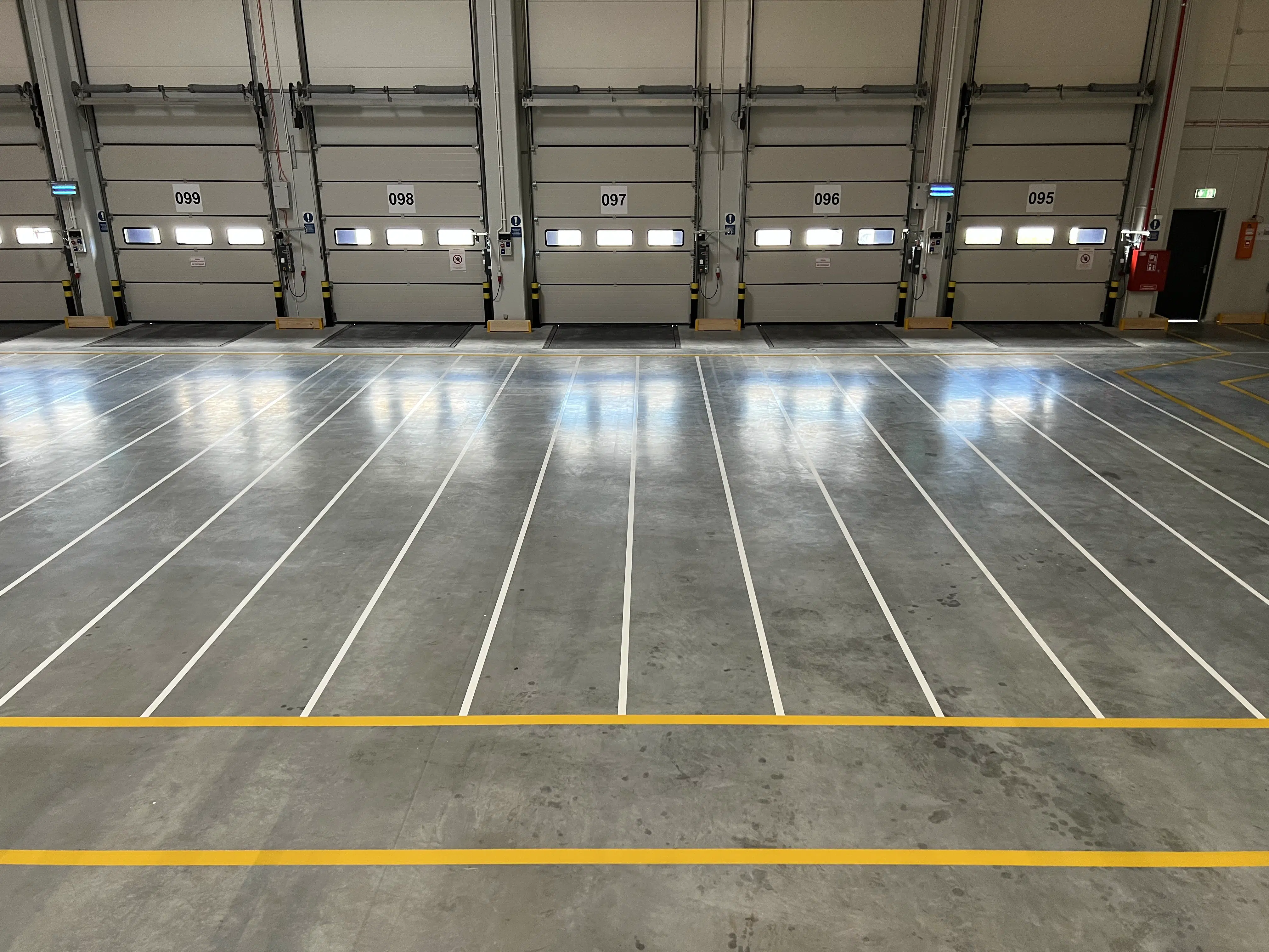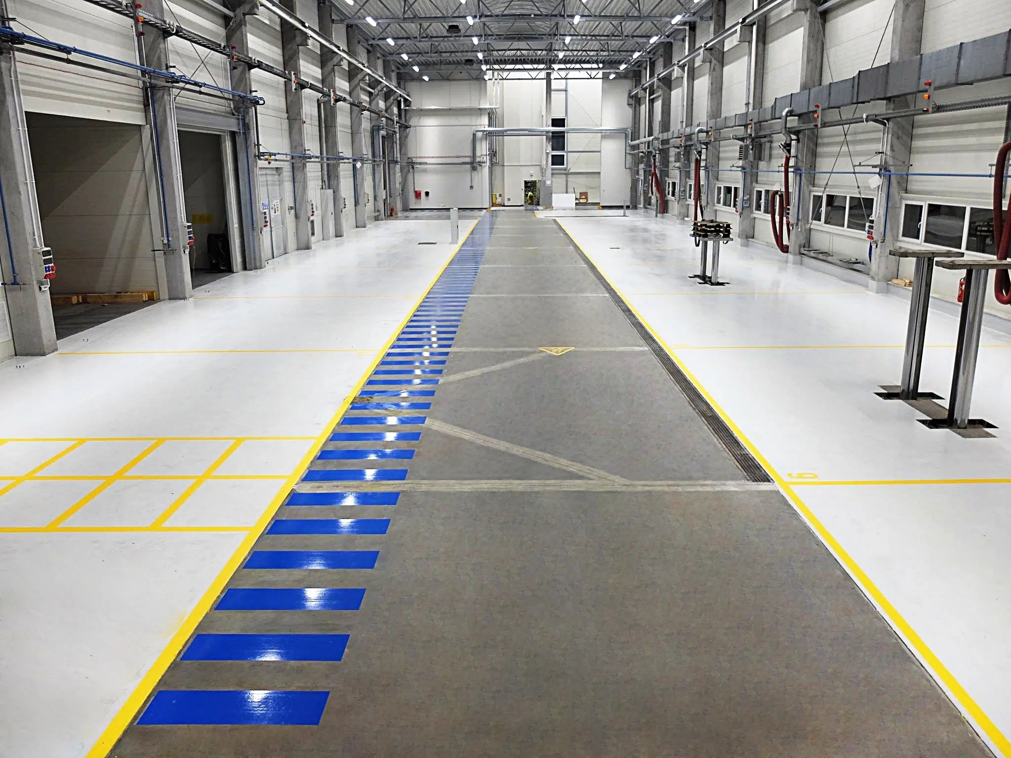 Dünnschichtige Bodenmarkierung in Industriehallen