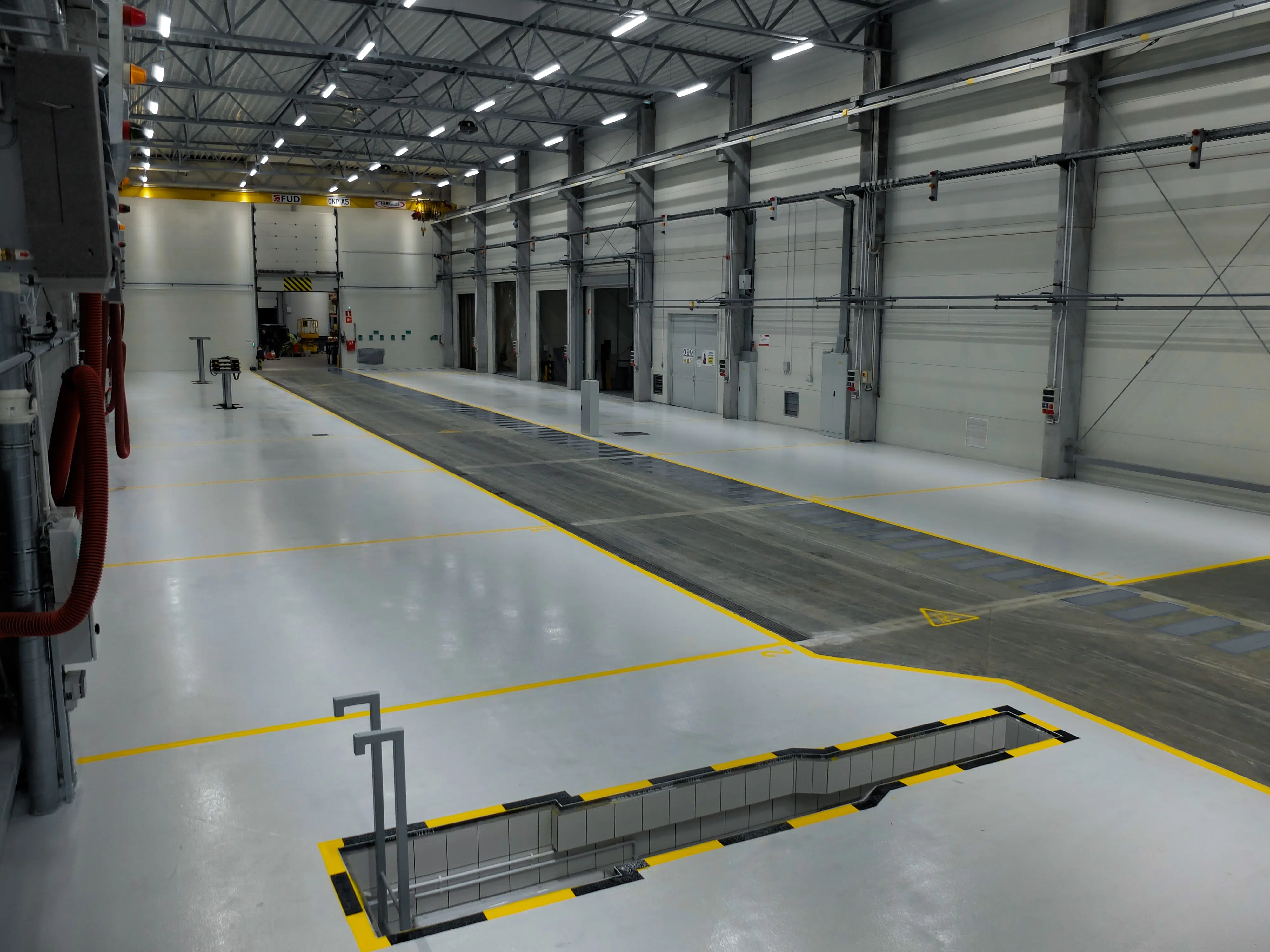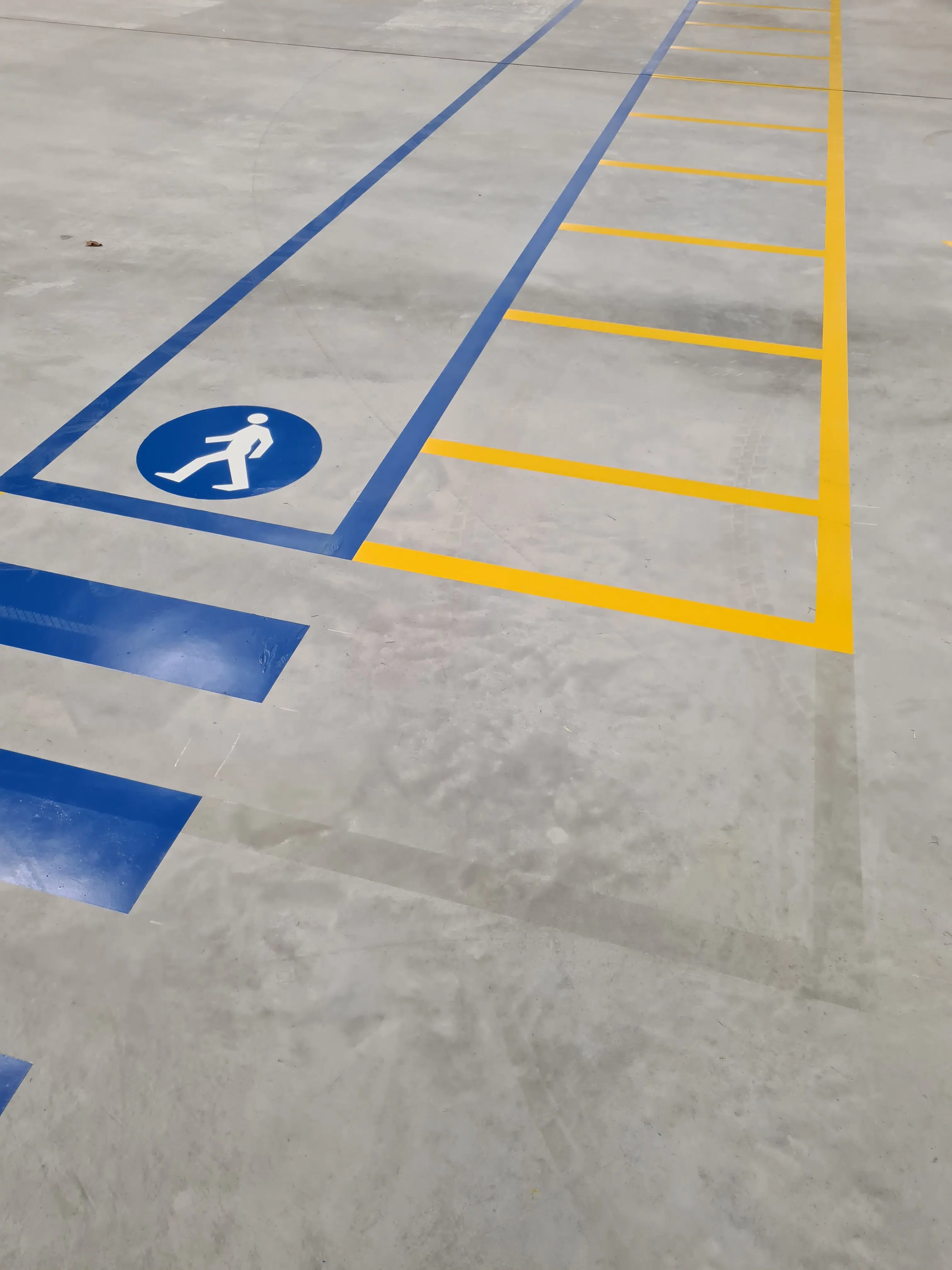 Für Produktionshallen bieten wir umfassende Dienstleistungen im Bereich Markierung und Renovierung an, die die Raumorganisation, Sicherheit und Ästhetik verbessern. Wir führen dünnschichtige Bodenmarkierungen durch, darunter eingelassene Linien – gefräst und mit Harz gefüllt, die sich durch Langlebigkeit und Präzision auszeichnen.